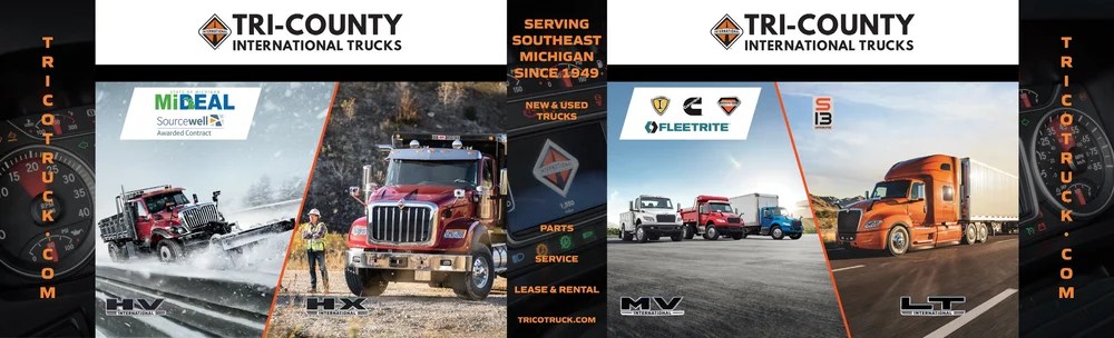This 8.5′ wide magnetic banner I designed for Tri-County International Trucks projects durability and reliability. The diagonal division of images based on the company’s style guide move the eye across new and used inventory, service, parts, and leasing.