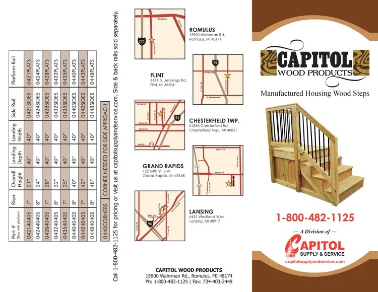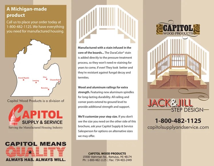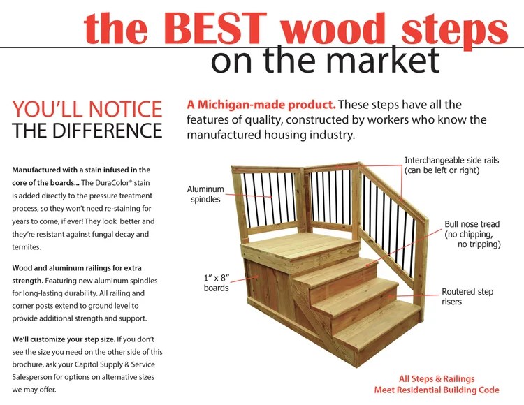 A Capitol Wood Products, a division of Capitol Supply & Service, tri-fold brochure showcasing the company’s standard enclosed best-selling wood steps, crafted locally in Michigan. The design is sales-oriented, using visual hierarchy and clear language to highlight the product’s quality and features. The primary colors are a bold red for titles and accents, black for main body text, and the natural light brown/tan color of the wood product itself, set against a white background that is consistent with Capitol’s brand, to create a high-contrast, easy to read presentation. I used a single, high-quality photograph of the assembled wood steps is the main visual element and clearly labeled it with various features to help potential customers understand the product’s construction and benefits.