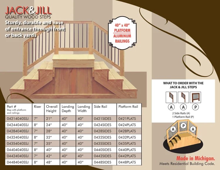 Designed with a warmer color palette, the Jack & Jill step tri-fold brochure from Capitol Wood Products, a division of Capitol Supply & Service, highlights the double step with platform with a bold white silhouette on the front and back of the brochure. The table and diagram on the inside indicate the proper components and measurements of the step to order. The blocks of solid color and swirl design are a reflection of stability and elegance.
