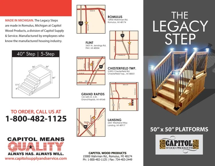 A wood step tri-fold brochure called “The Legacy Step” I designed for Capitol Wood Products, a division of Capitol Supply & Service. The informative diagrams display step measurements which play a critical part in ordering. The gray, red, and black bold color scheme is consistent with Capitol’s branding.