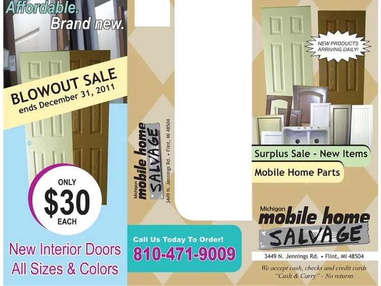 I made this Michigan Mobile Home Salvage tri-fold brochure in an eye-catching and vibrant color scheme with light blue, green, white, and gold/tan hues to advertise “Brand new” and “Affordable” mobile home parts, specifically interior doors. The text uses a mix of bold, large fonts for emphasis on the “BLOWOUT SALE” and price, with smaller text for details like the address and payment methods. Images of various interior doors and other home salvage items like a sink and mirrors are prominently featured. It conveys a sense of urgency and value through the use of “Blowout Sale,” “Affordable,” and “Brand new” language, along with the bold visual presentation.