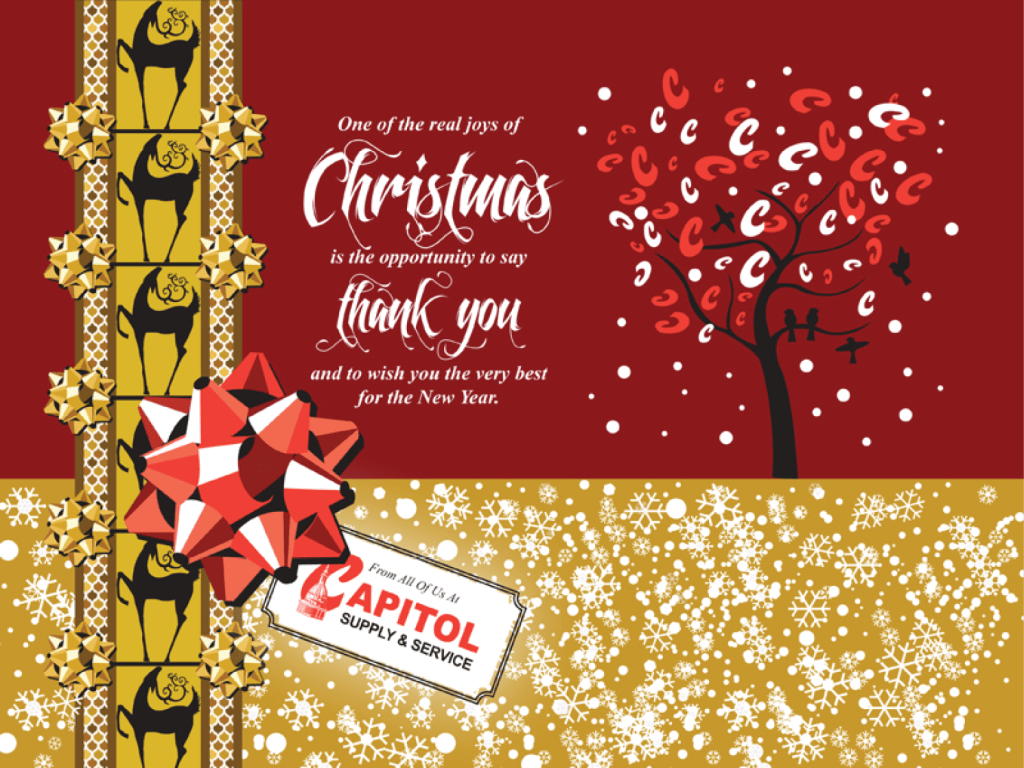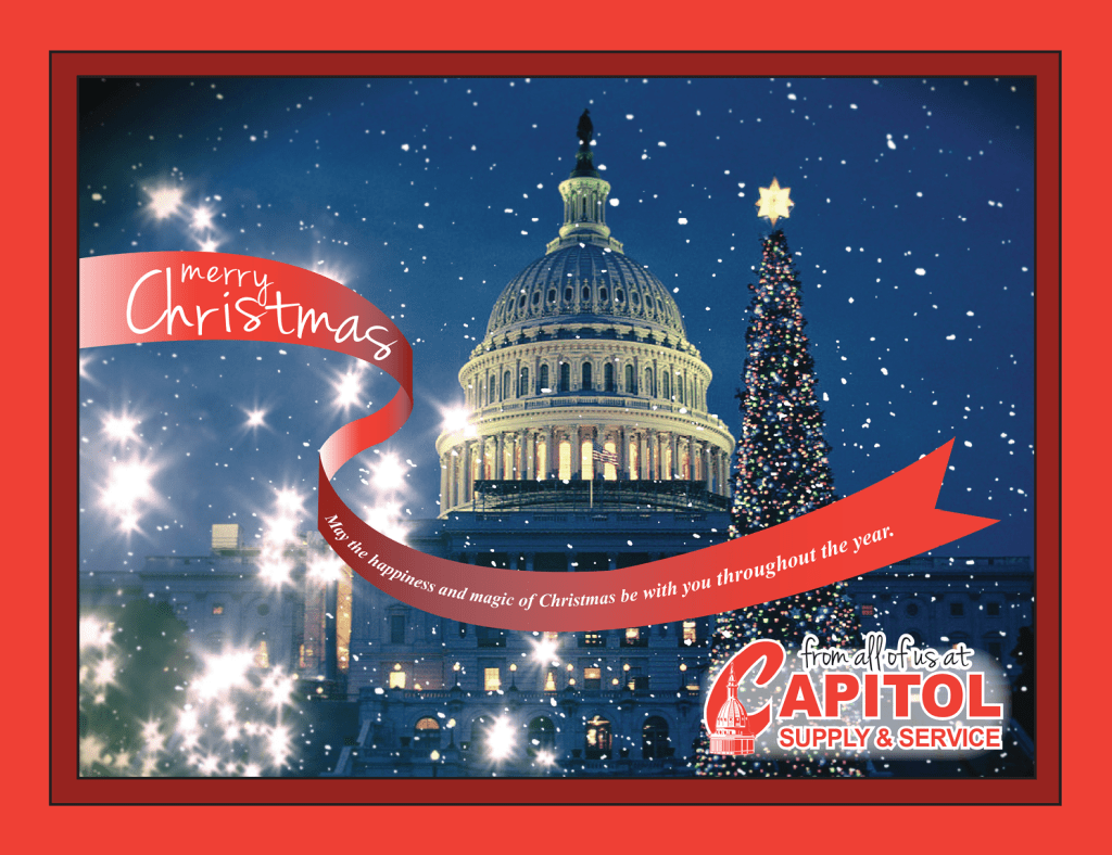 I designed a red ribbon to flow across the image of the US Capitol building, reflecting a “gift”, the holiday season, and branding by using the Capitol Supply & Service logo colors in a red/white/black gradient and enclosing the image with a solid black and Capitol red border to keep the color scheme balanced.