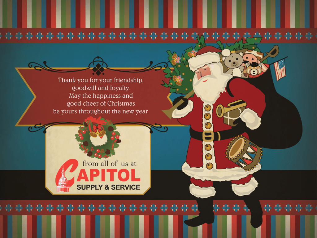 I designed this calendar cover for Capitol Supply & Service in a vintage, retro-inspired aesthetic, to portray a traditional Christmas feeling. The classic, hand-illustrated Santa with a bag full of toys is reflective of Capitol’s traditional values, and the logo, drum, and USA flag represent am American company. I chose a darker red than the Capitol logo for a more vintage appearance and to keep the focal point on the logo.